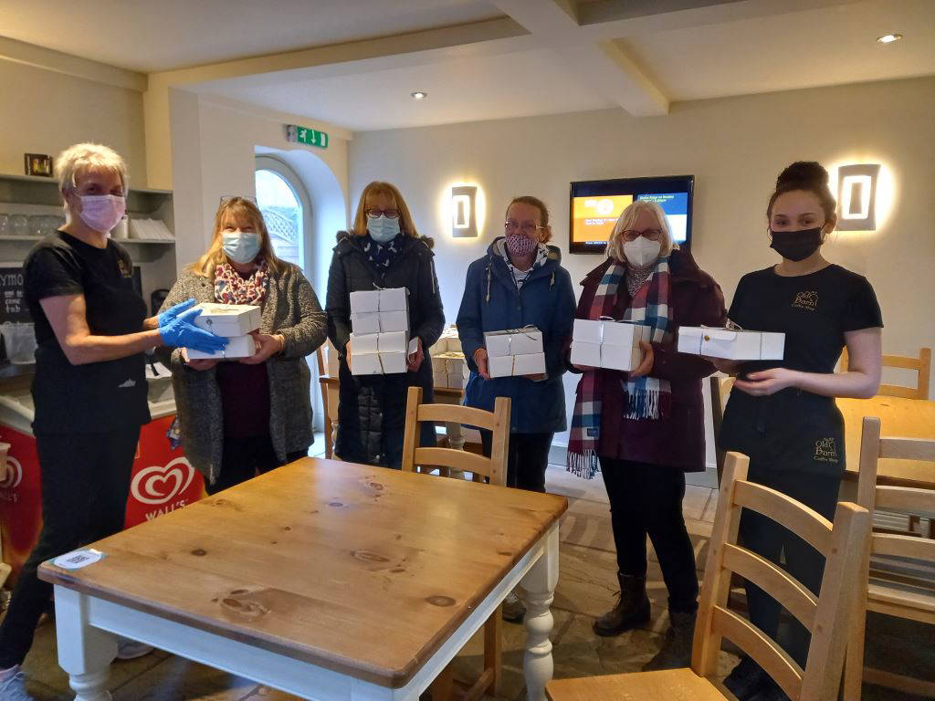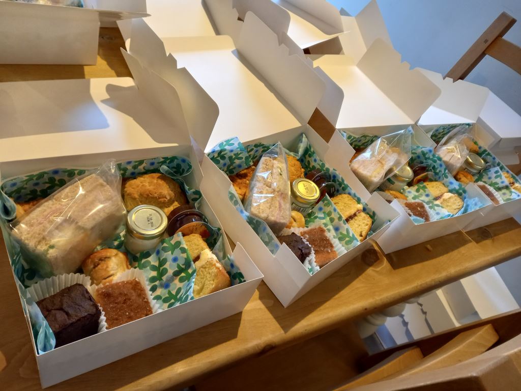 Thanks go to our coffee shop team of Claire, Isobel, Katie and Juliet for preparing the boxes, and to society members Debbie, Carol, Julie, Cath, Lucy, Ella and Katie for handing them out. The boxes were filled with a selection of homemade afternoon tea treats comprising four finger sandwiches, a slice of cheese quiche, a sausage roll, a slice of Victoria sponge, a slice of lemon drizzle, a slice of chocolate fudge cake, and a sweet scone with strawberry jam and clotted cream.